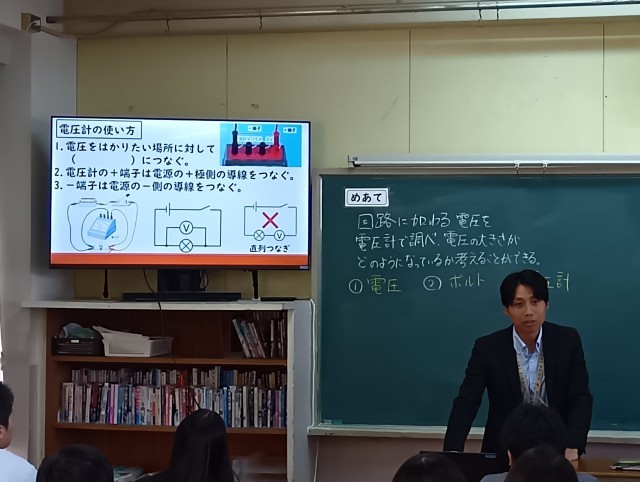 授業のめあては「回路に加わる電圧を電圧計で調べ、電圧の大きさがどのようになっているかを考えることができる」でした。今日も分かりやすく作られたパワーポイントとワークシートが印象的でした。子どもたちへのメッセージボードも継続されていました。