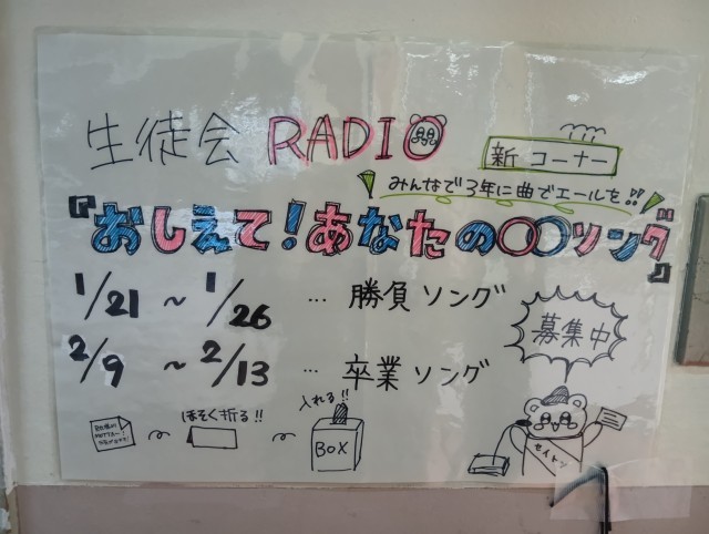 生徒会の新たな取り組みとして、「教えて、あなたの◯◯ソング」と題して、卒業を控えた3年生にエールを送るための勝負ソングアンケートと卒業ソングアンケートを取ります。皆さんのご協力をお待ちしています。