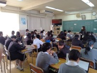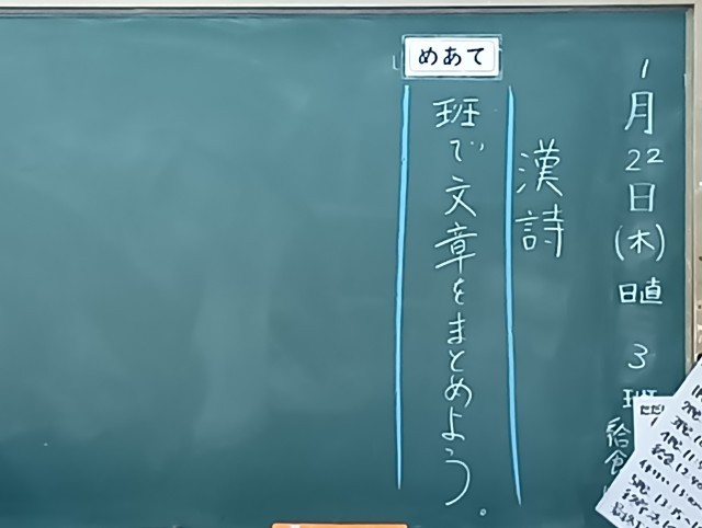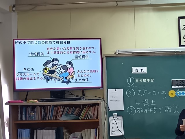 学習内容は「漢詩」でした。授業のめあては「班で文章をまとめよう」でした。班で役割分担し、教科担当の指示された課題に向かって、作業を始めていました。