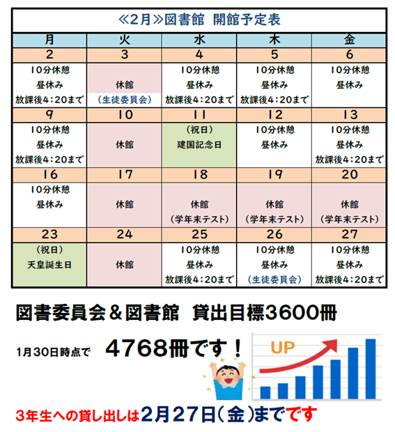 3年生への貸し出しは2月27日(金)までです。よろしくお願いします。