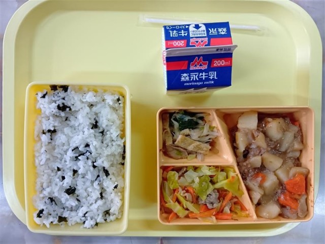 今日の給食は、わかめごはん、じゃがいものそぼろ煮、野菜炒め、切干の和え物、牛乳です。