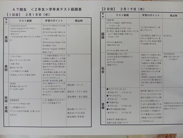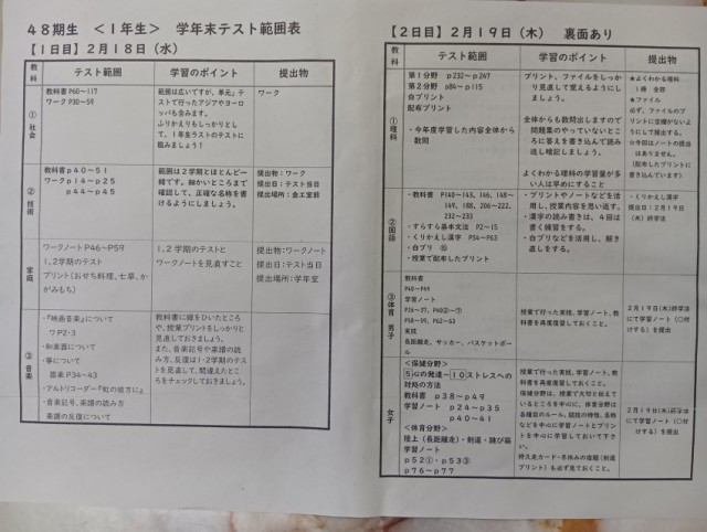 2月18日(水)から行われる学年末テストのテスト範囲表を今日の終学活で配付しました。