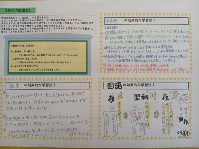 今日の学習内容は「勉強の仕方」でした。2年生所属の先生方の勉強方法や、各教科担当の先生から5教科の勉強方法を聞き、プリントにまとめられていました。『勉強の三箇条』が印象的だったので紹介します。