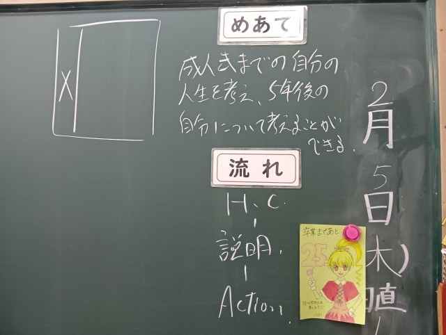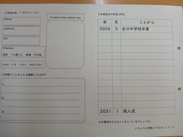 授業のめあては「成人式までの自分の人生を考え、5年後の自分について考えることができる」でした。班活動を通して、話し合いながら、各自で5年後の姿を語り合っていました。とてもいい雰囲気の授業でした。