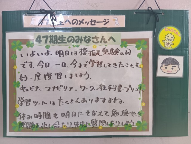 明日行われる模擬受験(実力テスト)に向けて、メッセージが書かれていました。47期生のがんばりを期待しています。
