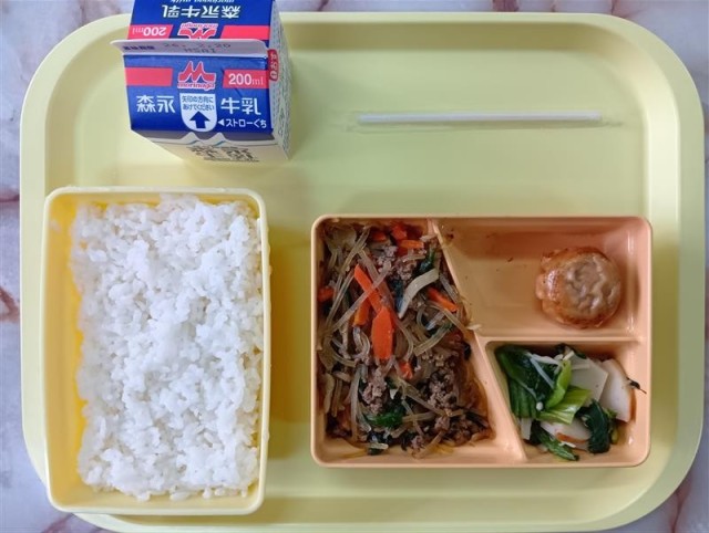 今日のメニューは、白ごはん、チャプチェ、味噌まんじゅう、チンゲン菜とえのきの和え物、牛乳です。