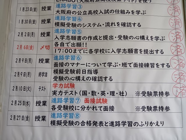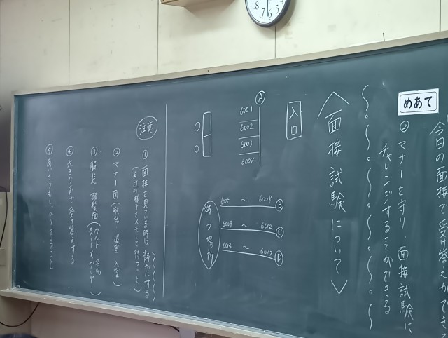 服装を正し、言葉遣いに気をつけ、初めて行う面接試験に緊張しながらも、子どもたちはよくがんばっていました。次回の進路学習が最終回になります。内容は「模擬受験の合格発表と進路学習のふりかえり」です。