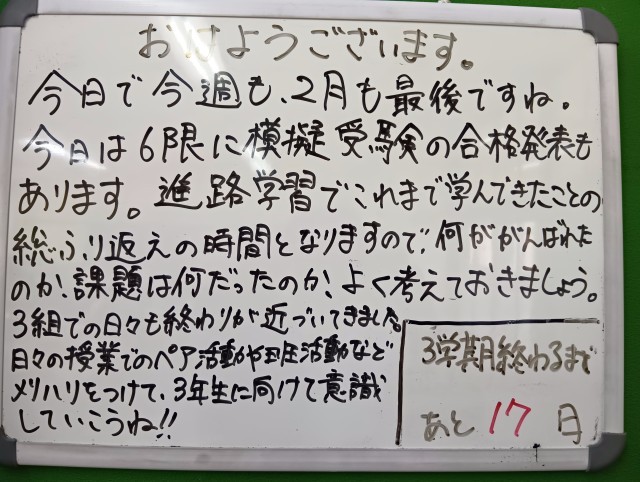 学習プリントを使って、調べ学習が行われていました。担任の先生のメッセージボードも継続中です。修了式まで、あと17日になりました。