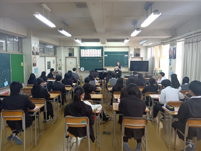 学習内容は「さくらさくらの前奏をつくろう」でした。テスト返却のあと、教科担当の先生が生徒に桜から連想するものを質問していました。子どもたちからは、たくさんの答えが返ってきていました。