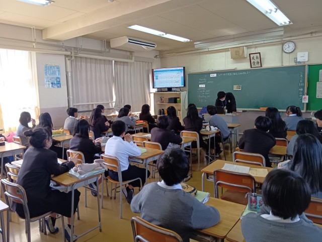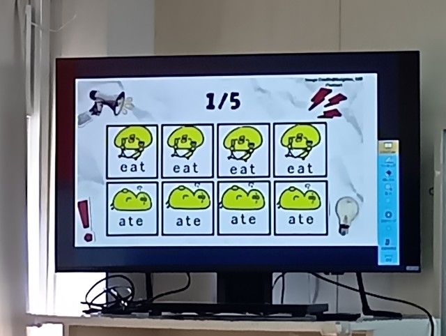 子どもたちが創作した発音の間違えやすい単語を並べたパワーポイントの紹介がありました。音楽に合わせて、声を揃えて、大きな声で、楽しく発音練習ができていました。