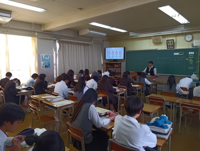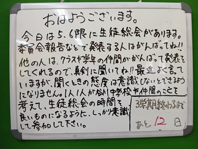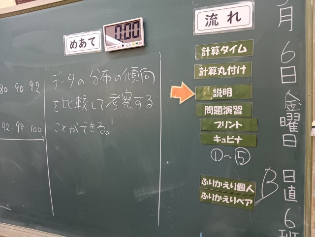 授業のめあては「データの分布の傾向を比較して、考察することがてきる」でした。とても静かな教室でした。担任の先生からのホワイトボードメッセージは、継続中です。