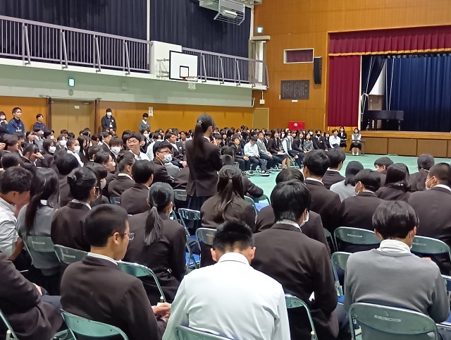 生徒総会の第二部として、「クラスや学年、仲間のいいねエピソード」をみんなで語り合いました。自分がうれしかったエピソードを勇気を出して、全校生徒の前でたくさんの生徒が発表できていました。温かい拍手に感心しました。