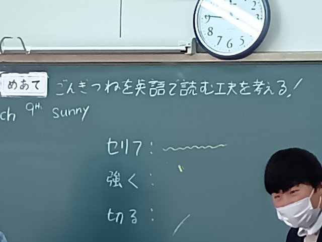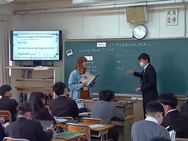 授業のめあては「ごんぎつねを英語で読む工夫を考える」でした。今日も本校の英語科の教員とAET(英語実習助手)との授業中の連携は抜群でした。