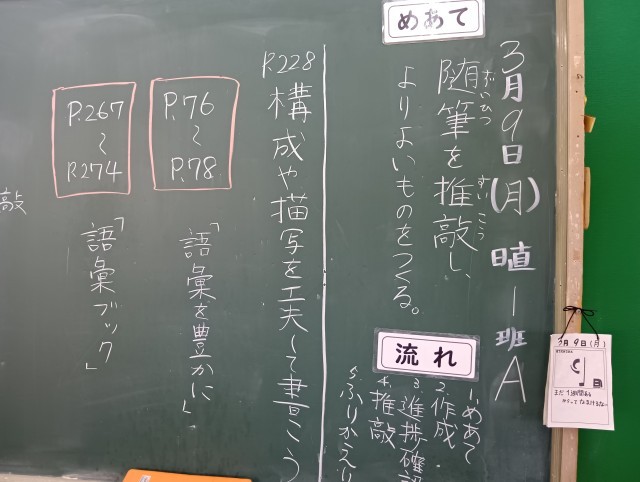 授業のめあては「随筆を推敲し、よりよいものをつくる」でした。今日も授業のめあてや流れがきちんと黒板に示されていました。