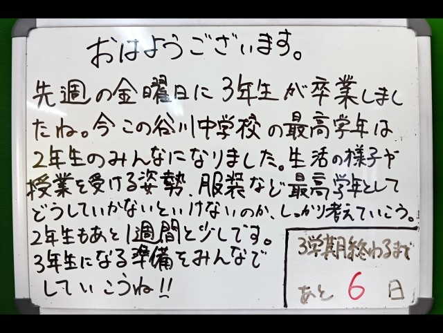 学習内容は「現在完了形」でした。3年生が卒業しても気を抜くことなく、2年生はがんばっていました。修了式まで、あと6日です。