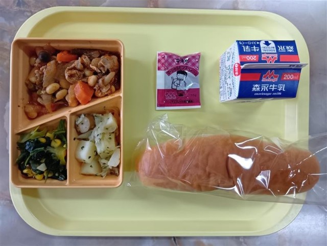 今日のメニューは、コッペパン、ポークビーンズ、じゃがソーセージ、ほうれん草のサラダ、チョコレートクリーム、牛乳です。