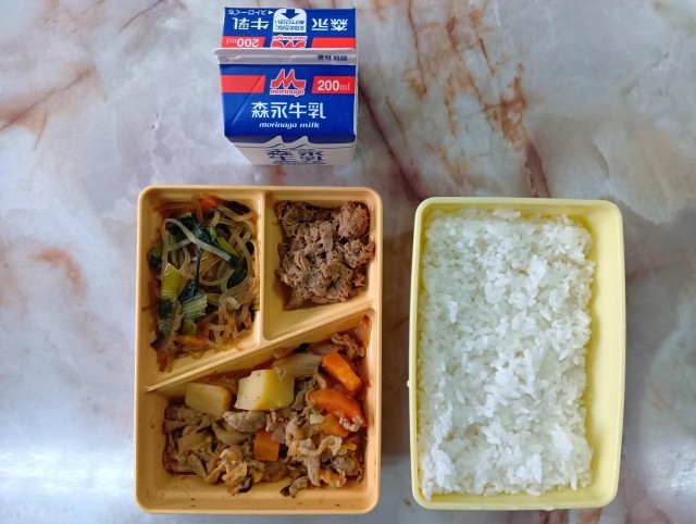 今日のメニューは、白ごはん、キムチ豚じゃが、小松菜と春雨の炒め物、かつおそぼろ、牛乳です。