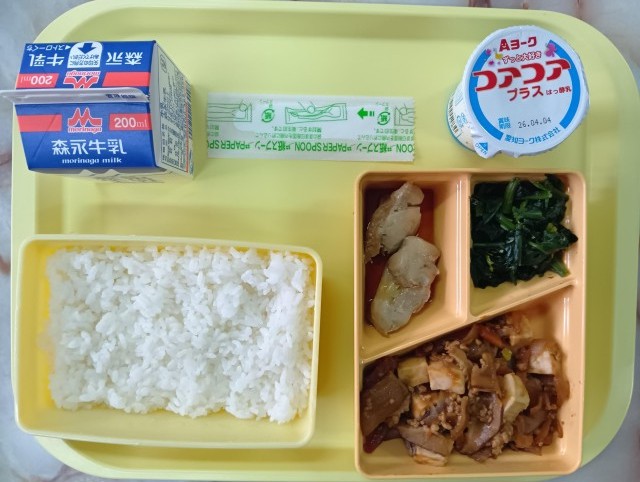 今日のメニューは、白ごはん、マーボードーフ、鶏肉の照り焼き、ほうれん草のしらす和え、ヨーグルト、牛乳です。