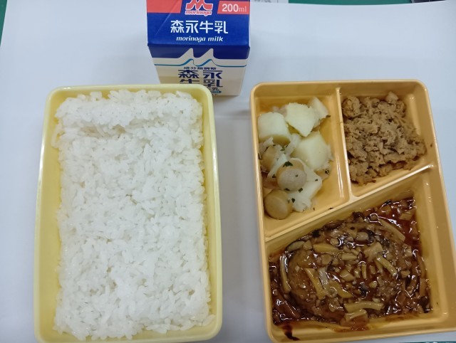 今日の給食は、ごはん、照り焼きハンバーグ、じゃがソーセージ、シーチキンのそぼろ煮、牛乳です。