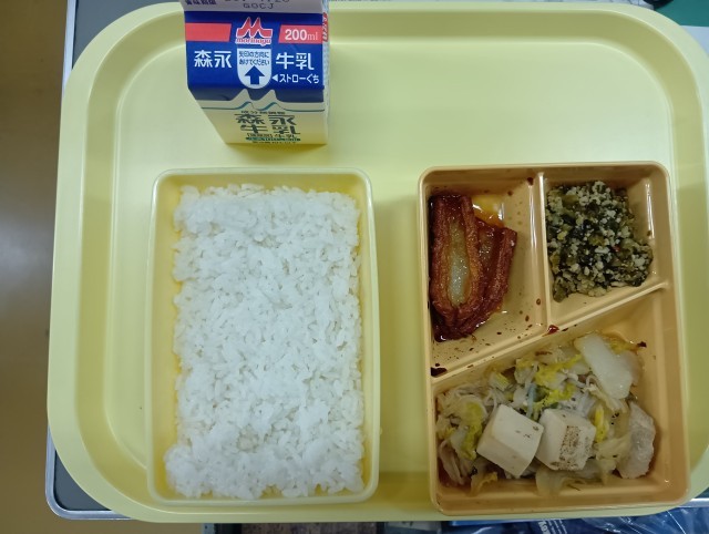 今日の給食は、ごはん、とりすき焼き風にこみ、ちくわのかば焼き、ピリ辛高菜そぼろ、牛乳です。
