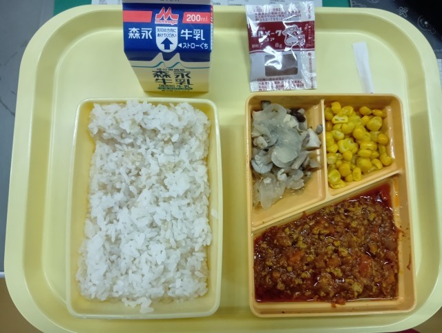 今日の給食は、もち玄米ごはん、ドライカレー、鶏としめじの洋風炒め、ボイルコーン、ミルメークココア、牛乳です。