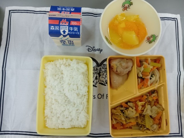 今日の給食は、ごはん、スタミナ炒め、鶏肉のゆずこしょう焼き、切干の和え物、フルーツミックス、牛乳です。