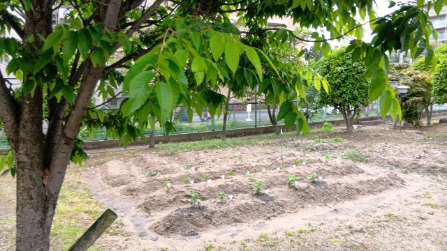 (写真は、地域の方が耕してくださった中庭のひまわり農園です)