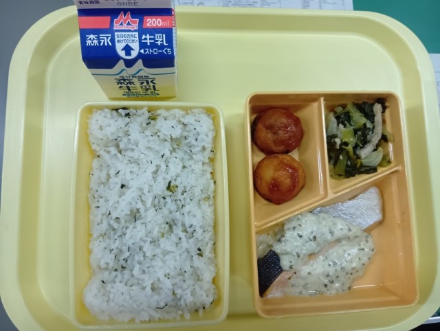 今日の給食は、菜めし、鮭のマヨネーズ焼き、米粉たこやき、小松菜のサラダ、牛乳です。