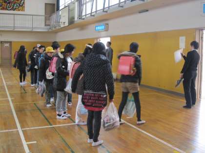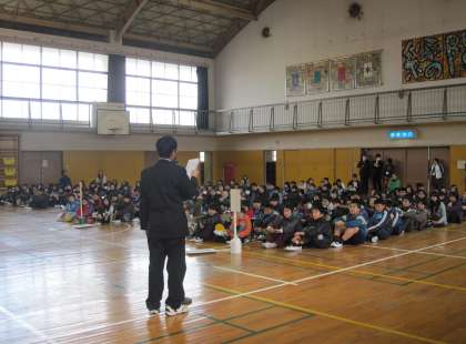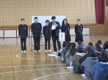 まず体育館に集合して、体験授業の説明と生徒会役員からのメッセージがありました。