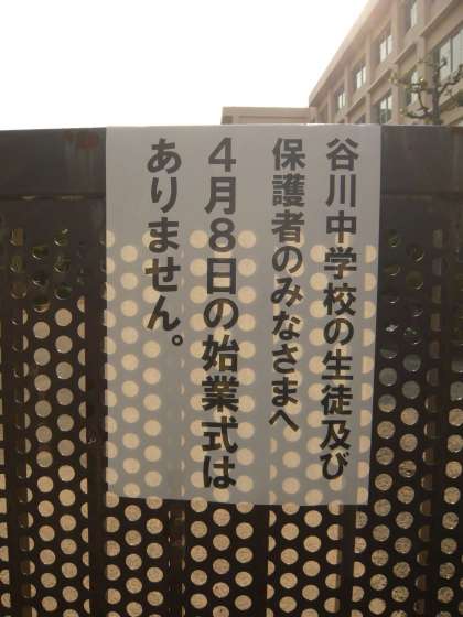 校門にも貼り紙をしました。本日の始業式は延期となります。生徒の皆さんは、引き続き不要不急の外出は控え、自分や家族の命と健康を守るための行動を心がけてください。4月9日以降の動きについては、市教委の指示や各校との協議の中決まっていくと思われます。