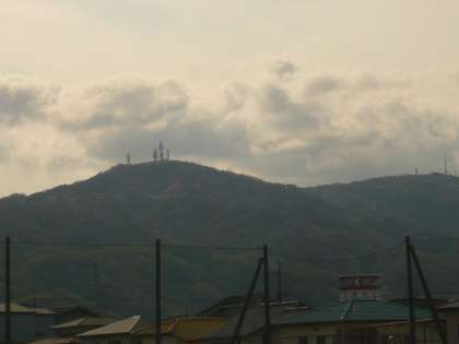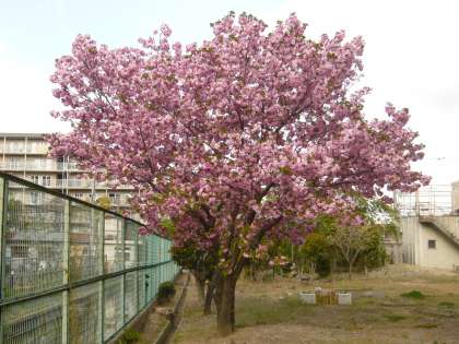 中庭の八重桜が満開です。生駒の山の木々も新緑が感じられるようになってきました。