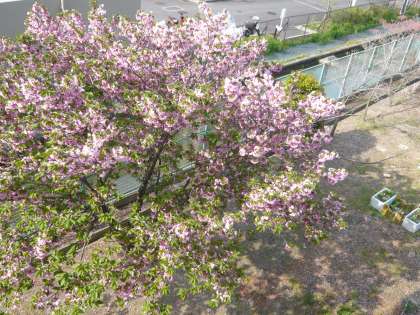 4月16日(木)、今日もおだやかな天候です。中庭の八重桜も葉桜になってきました。