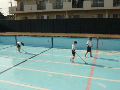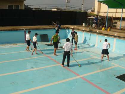 谷川中学校は水泳部があり、プールを使用する関係で、水泳部の生徒、顧問の先生、体育科の先生でプール清掃をしています。(今年は、体育での水泳の授業はありません)