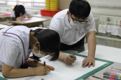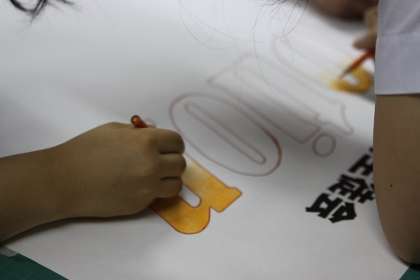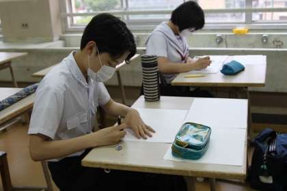 美術部の部員が、生徒会のスローガンを制作しています。