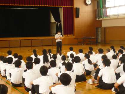 最初に司会のあいさつです。1年生にはガイドブックが配付されました。