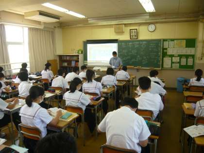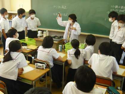 4組は、教室の前で先生が模範実験です。生徒たちは、興味津々で見つめていました。