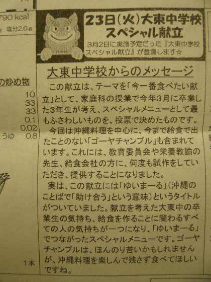 大東中学校からのメッセージを読むと、この献立には深い思いが込められていることがわかりました。初めての沖縄料理中心の献立です。