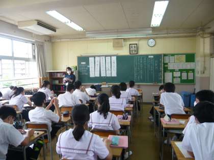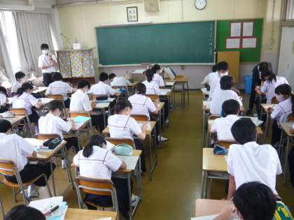 2年2組は数学の授業です。プリントの問題に取り組んでいます。
