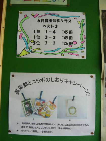 貸し出し最多クラスや「美術部とコラボのしおりキャンペーン」の紹介もあります。本を30冊借りた人に、美術部が制作したしおりがプレゼントされるそうです。