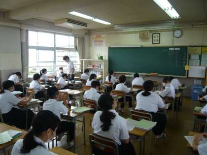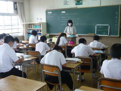 1限、1年1組は数学。問題を解いています。2組は国語。先生が机間を回ってアドバイスしています。