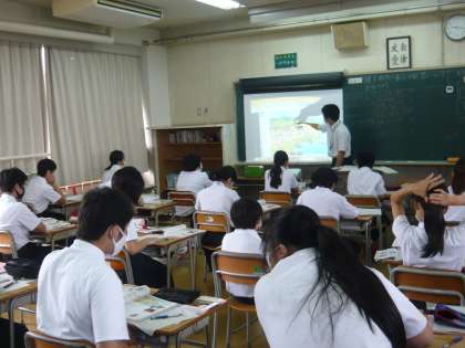 1限、1年3組は社会。縄文時代の暮らしについて写真資料を見て学習しています。