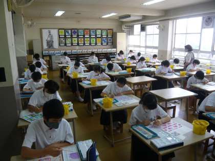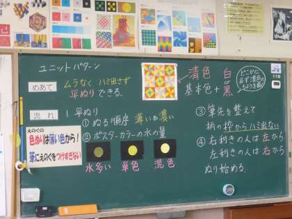1年4組は美術室で美術の授業です。ユニットパターンの制作です。