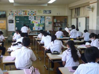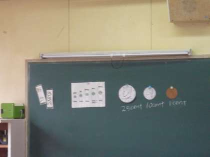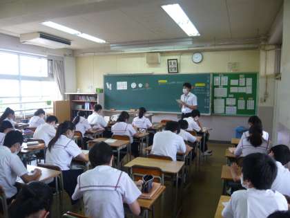 1限、2年3組は英語の授業です。英語で買い物ができるように勉強しています。