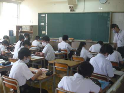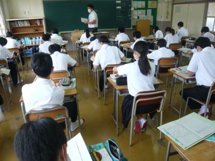 1限、1年3組は社会科地理の授業です。いろいろな国の位置を覚えています。