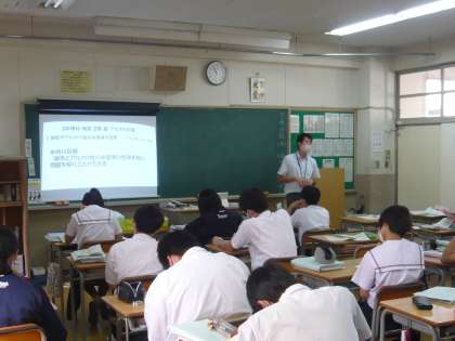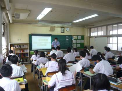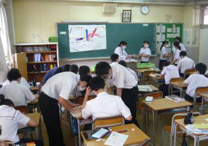3年4組理科、2年3組理科、2年4組社会の授業です。
