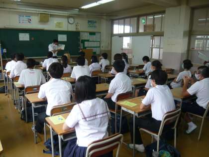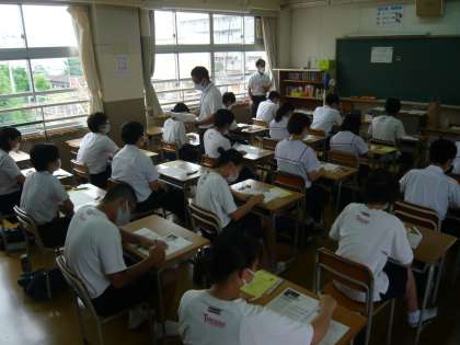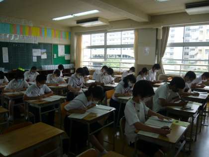 先生の説明を聞いているところ、問題を配ってもらっているところ、テスト開始直後の写真です。