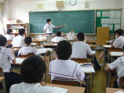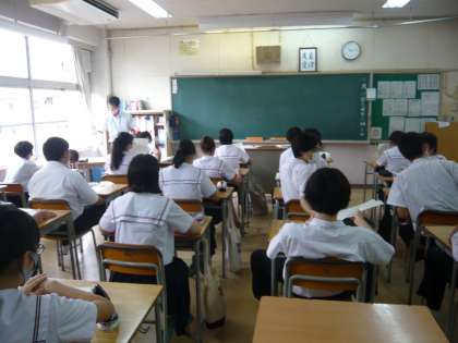 2限、3年3組は理科の授業で、テスト返しの後、さっそくテストのやり直しです。問題が配られています。4組は数学の授業で、テスト返しの後、先生の解説を聞いています。