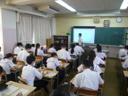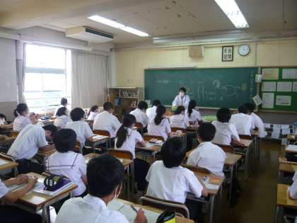 3組は小テストに取り組んでいました。4組は呼吸運動の学習です。