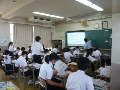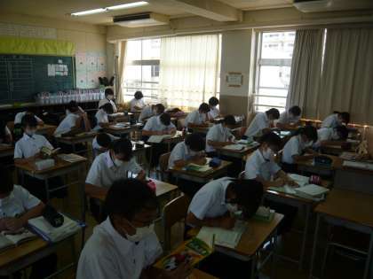 3限、1年3組は国語の自習で、静かにワークをやっていました。4組は理科の授業です。