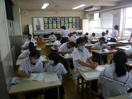 3年1組は美術、点描画を描いています。楽しそうです。3年2組は数学です。先生の解説を聞いています。